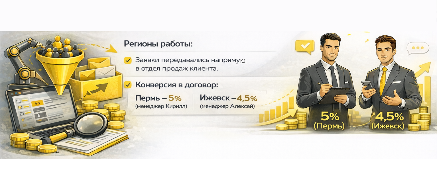 Все заявки передавались напрямую в отдел продаж клиента. В Перми работал менеджер Кирилл, в Ижевске – Алексей. Лиды не перемешивались, каждый вёл свой регион. Это позволило нам позже сделать важный аналитический срез.
